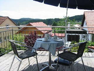 Balkon mit Gartenmöbeln, Sonnenschirm und schöner Aussicht